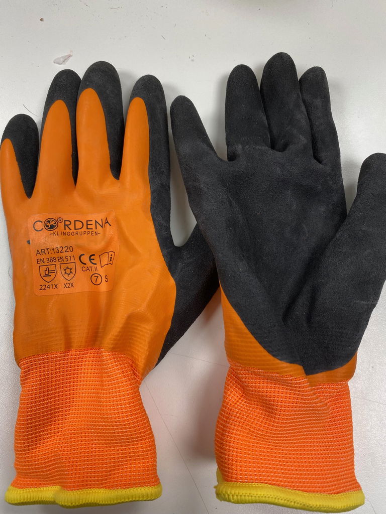 Storlek small. Kan användas utmärkt till ex. fiskrensning, trädgårdsarbete och annat där det krävs varma handskar och vattenskydd.
